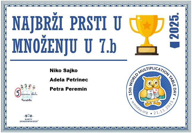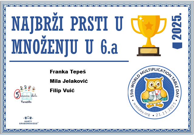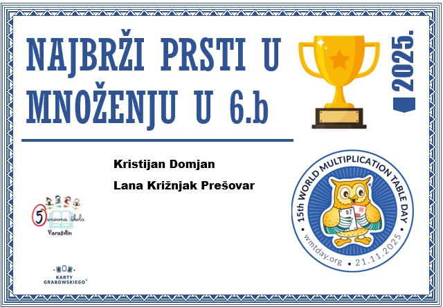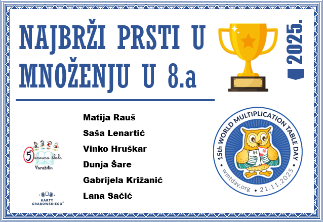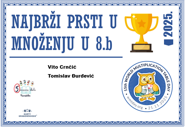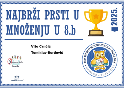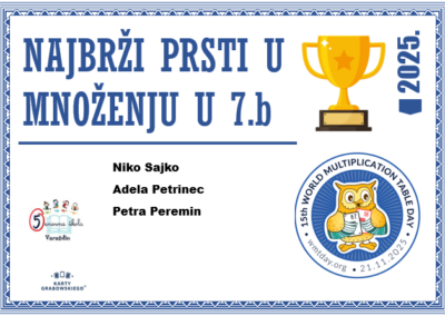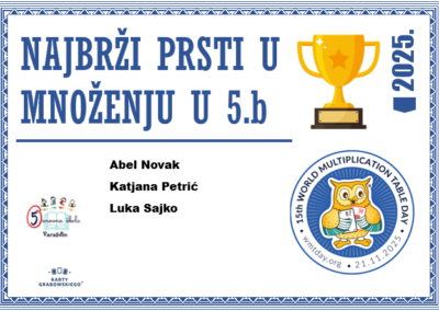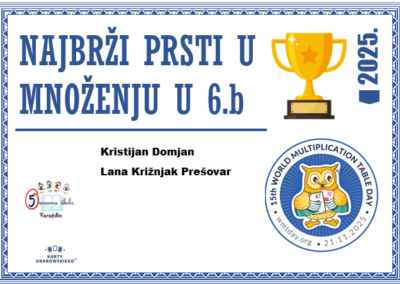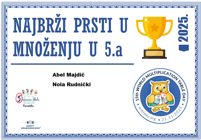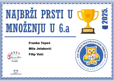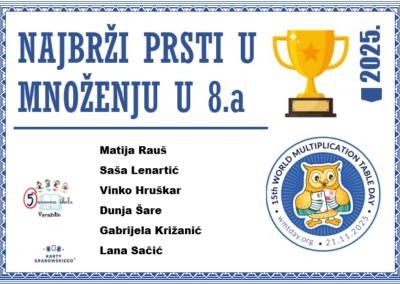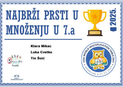 Učenici koji su u razrednom odjelu najbolje riješili kviz dobili su titulu „Najbrži prst za množenje u 2025. godine“. Popis učenika koji su osvojili titulu možete vidjeti na slikama.